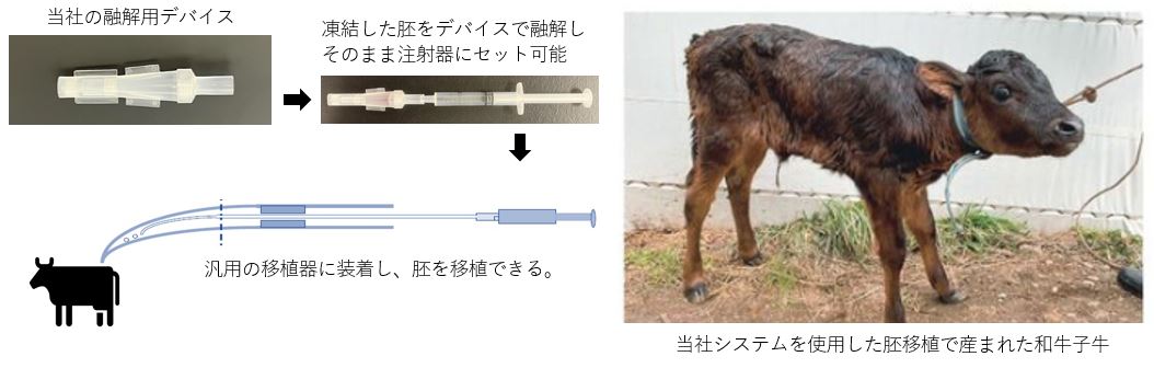 また、凍結保存技術を様々な動物種に展開しています。その中で凍結胚を融解するシステムを新たに開発しました。この融解用デバイスと凍結保存デバイス「Diamour」を併用することによって、融解した凍結胚を牛舎でダイレクトかつ簡単に母牛に移植することができるようになり、畜産分野の発展に貢献しています。